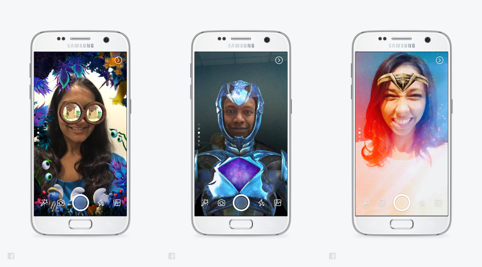 A câmera do Facebook traz dezenas de efeitos, como máscaras, molduras e filtros interativos que você pode aplicar a suas fotos e vídeos. Os efeitos reativos permitem que você interaja com objetos dinâmicos – como neve caindo – e os efeitos de estilo aplicam um filtro artístico ao seu vídeo em tempo real, permitindo que você transforme sua selfie em uma obra de arte ao estilo Picasso.