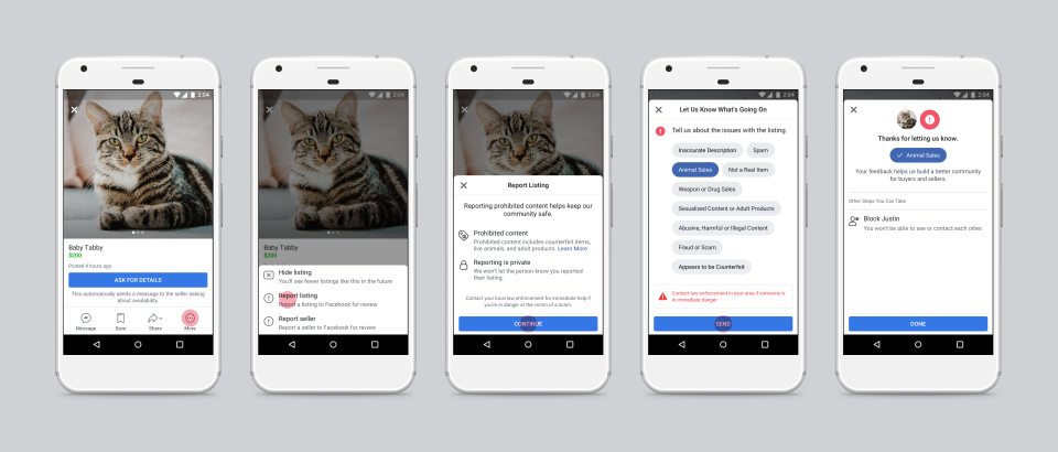 - Ferramentas de relatórios mais robustas: Nossa comunidade nos ajuda a tornar a compra e a venda melhores para todos, ao reportar conteúdo que não pertence ao Marketplace. Se vir um item à venda que acredita violar nossas Políticas Comerciais, você poderá denunciar o classificado diretamente no aplicativo. Você também pode denunciar compradores e vendedores caso veja alguma atividade que acha que não deveria estar no Facebook.