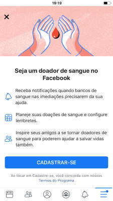 A ferramenta de Doação de Sangue do Facebook está disponível no Brasil desde maio de 2018. A ferramenta notifica aqueles que são cadastrados na rede social como doadores quando há bancos de sangue nas imediações precisando de doações, e até hoje estava disponível para 13 Hemocentros em 11 Estados.