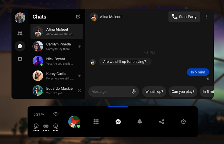 Hoje, anunciamos que o Messenger chegará à Plataforma Quest nos próximos meses, tornando mais fácil combinar com os amigos para jogar juntos em VR. Também será possível bater um papo com seus contatos, sem tirar o headset, por qualquer lugar em que eles tenham o Messenger.