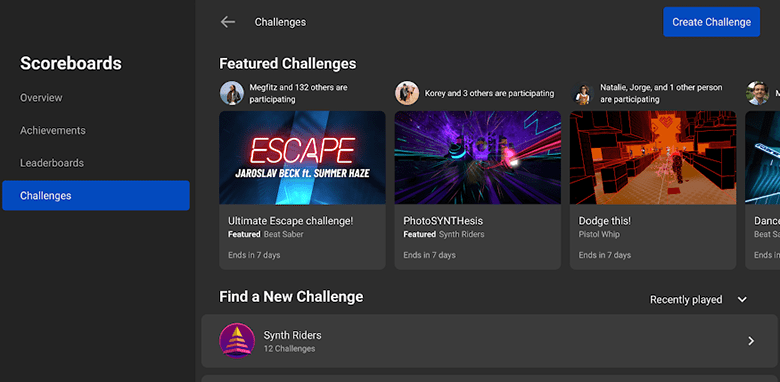Lançamos ainda o Desafios, que permite que você crie mini torneios para seus amigos e a comunidade de VR. Os desenvolvedores podem criar seus próprios desafios, começando com Beat Saber, Pistol Whip e Synth Riders. Eles terão novos desafios disponíveis semanalmente, para que você possa competir para ser o melhor dos melhores. Desafios começa a ser lançado no Quest hoje e estará disponível no Quest 2 quando o dispositivo for lançado, em outubro.