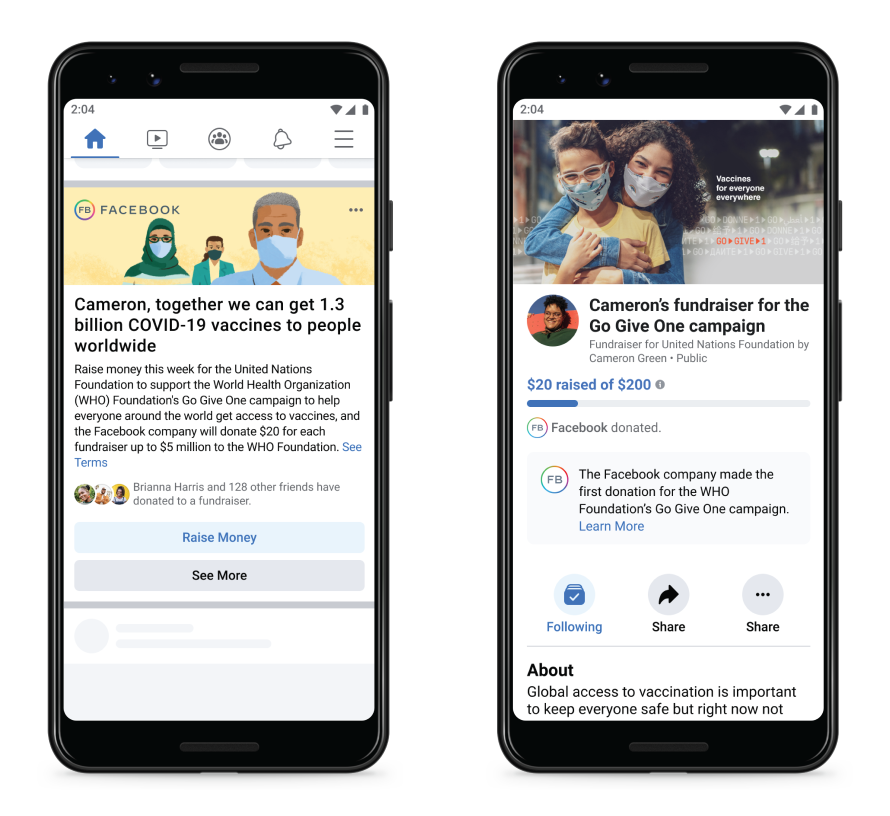 Mais de 700 milhões de doses de vacinas foram administradas globalmente, mas mais de 87% foram para países de renda alta ou média-alta. Para ajudar e equilibrar esses números, o Facebook está doando US$ 5 milhões para o Go Give One, uma campanha de arrecadação de fundos do COVID-19 criada pela Organização Mundial da Saúde. A campanha convida todos, em qualquer lugar do mundo, a fazerem sua parte ajudando a vacinar o mundo, com o dinheiro arrecadado indo para um fundo internacional chamado COVAX (Acesso Global à Vacina contra COVID-19). Ajudaremos doando os primeiros US $20 para cada Campanha de Arrecadação de Fundos criada no Facebook para a Fundação das Nações Unidas, começando a partir de 28 de abril nos Estados Unidos, Alemanha e Noruega. Essa arrecadação de fundos apoiará a distribuição equitativa de vacinas em todo o mundo, reduzindo a disseminação do COVID-19 e colocando os países no caminho da recuperação.