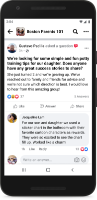 - Faça perguntas: quando alguém escreve uma publicação no Grupo que parece uma pergunta, a publicação é atualizada automaticamente para um formato que incentiva as pessoas a dar conselhos, informações ou opiniões.