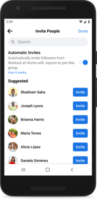 Para facilitar a interação dos especialistas com os seguidores, estamos lançando os convites automáticos. Esse recurso permite que os especialistas convidem os seguidores que interagiram recentemente com a Página a participar de Grupos. Conforme a comunidade cresce, eles poderão criar mais espaços colaborativos para discussões e compartilhamento de conteúdo.