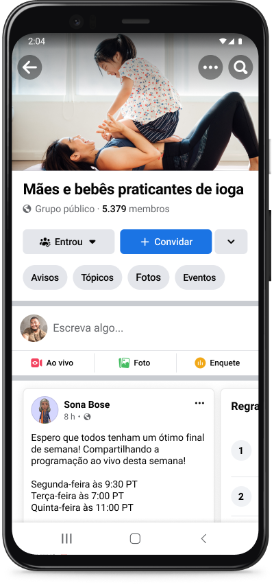 Com um feed principal para discussões no Grupo, pode ser difícil para os membros encontrarem o conteúdo com o qual desejam interagir. Estamos testando a capacidade dos administradores de criar subgrupos dentro dos Grupos para tópicos, regiões ou ocasiões específicas, que podem ser gerenciados em um só lugar, para que os membros possam se aprofundar mais no que lhes interessa.