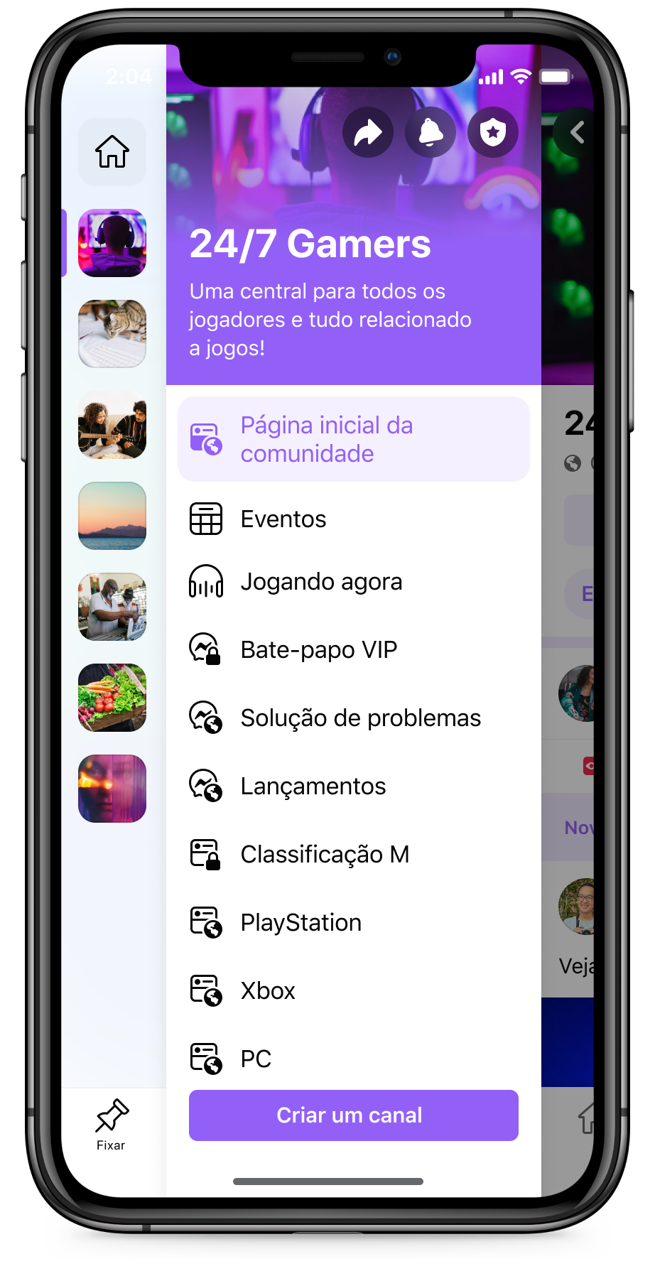- Também estamos testando “Canais”, que são espaços focados para as pessoas se conectarem em ambientes menores e mais casuais dentro de suas comunidades.