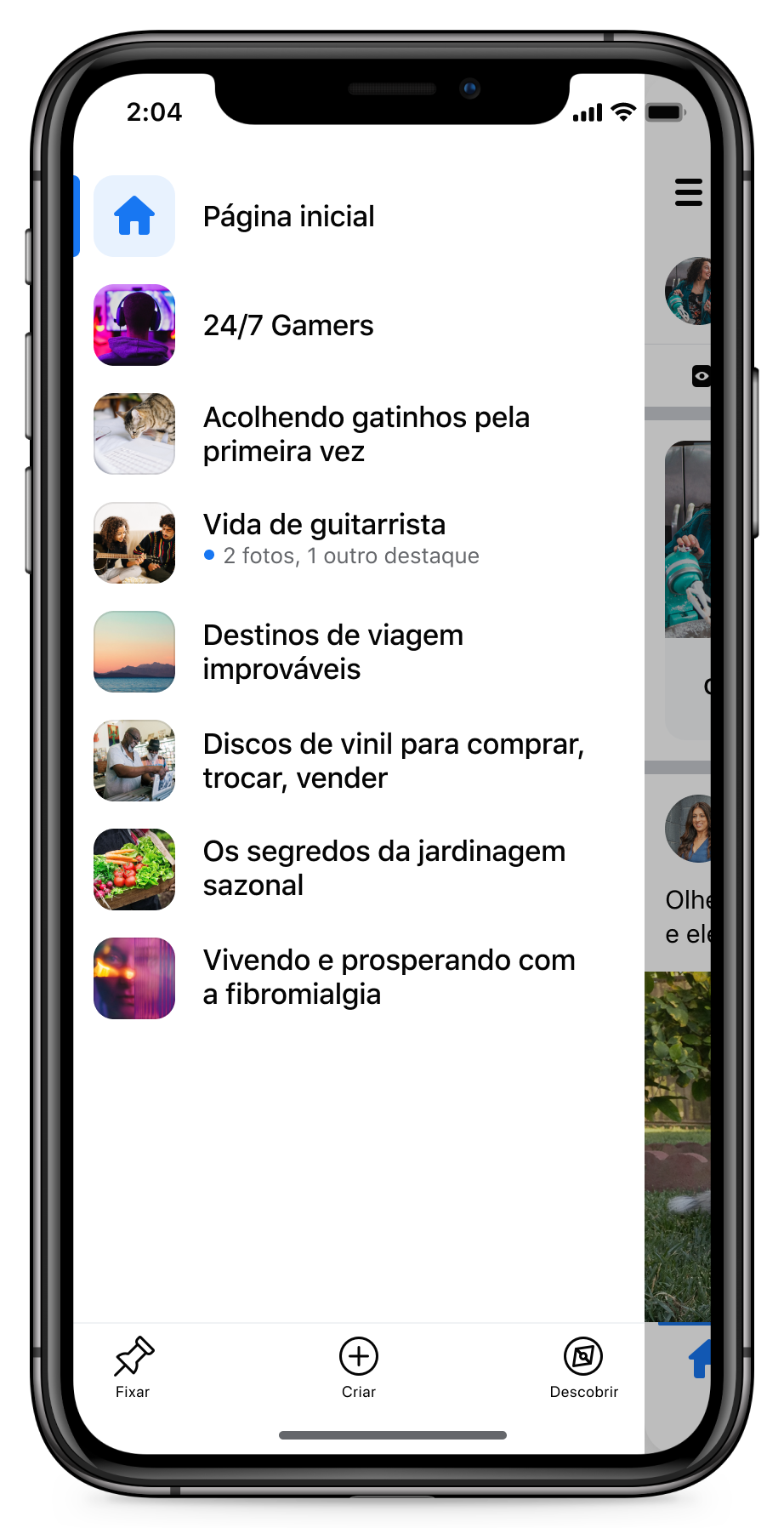 Estamos melhorando a organização de cada grupo, para que você possa ir direto ao que há de novo. Dentro do seu grupo, você verá um novo menu que inclui eventos e uma variedade de canais para facilitar a conexão com outras pessoas sobre os tópicos de seu interesse. Assim, quando estiver em seu grupo de culinária, você poderá se manter atualizado sobre os próximos eventos e participar de conversas mais facilmente.