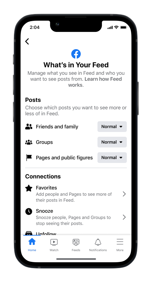 Continuamos a explorar maneiras de te ajudar a personalizar quanto conteúdo você verá no Feed a partir de publicações de amigos e família, Grupos, Páginas e criadores aos quais você está conectado. Essas funcionalidades – assim como Silenciar, Deixar de seguir e Reconectar, podem ser encontradas em Preferências do Feed.