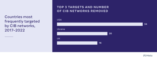 Mais de 100 países diferentes, do Afeganistão ao Zimbábue, têm sido alvo de pelo menos uma rede de CIB — estrangeira ou doméstica — desde que começamos nossos relatórios públicos. Os Estados Unidos foram o país mais visado por 34 operações, seguidos pela Ucrânia por 20 redes de CIB, e o Reino Unido, visado por 16 operações. Muitas vezes observamos essas redes encobertas se concentrarem em mais de um país por vez. Por exemplo, uma rede do Irã que interrompemos em abril de 2020 visava 18 países em quatro continentes.