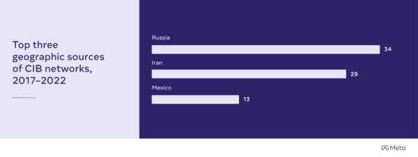 Rússia (34 redes), Irã (29 redes) e México (13 redes) foram as três fontes geográficas mais prolíficas de atividade de CIB — seja por atores estatais, grupos políticos ou empresas comerciais.