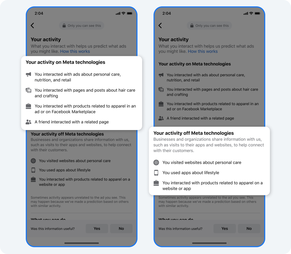 Essas novas funcionalidades são o passo mais recente em nossa evolução contínua na “Por que estou vendo esse anúncio?”. Seguiremos melhorando nossas possibilidades de transparência de anúncios e buscaremos novas maneiras de proporcionar às pessoas uma melhor compreensão sobre como usamos dados e tecnologia para lhes mostrar anúncios.