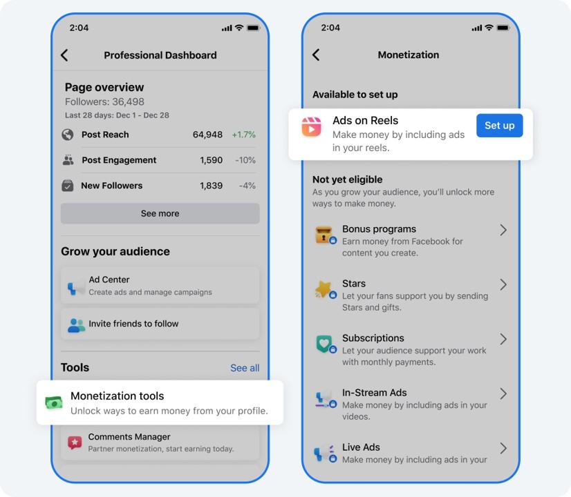Se você é criador e deseja verificar se faz parte deste programa inicial no Facebook, acesse o Painel de controle profissional e vá para a seção Ferramentas de monetização. Se você for convidado, deverá ver anúncios no Reels e selecionar “Set up” (Configurar) para iniciar a integração.