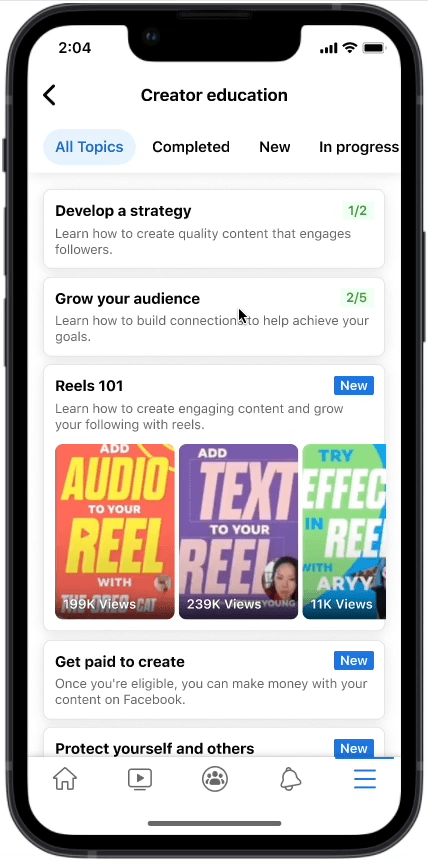 Agora também será possível aprender dicas, truques e melhores práticas diretamente no Painel Profissional, na guia “ensino para o criador de conteúdo”. Lá os criadores poderão acessar mais de 20 tópicos que o ajudarão a fazer sucesso no Facebook, como dicas fundamentais do Reels, como evitar erros de engajamento, como monetizar o conteúdo e entender a distribuição. Você também pode acompanhar seu progresso de aprendizado e ganhar selos enquanto vai aprendendo novas informações ao longo da sua jornada como criador.