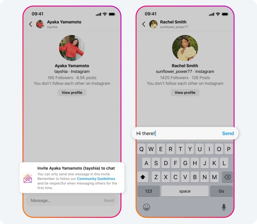 - Limitaremos esses convites de solicitação de mensagem a mensagens de texto, para que as pessoas não possam enviar fotos, vídeos, mensagens de voz ou fazer chamadas, até que o destinatário tenha aceitado a solicitação para o bate-papo. Essas alterações significam que as pessoas não receberão fotos, vídeos ou outros tipos de mídia indesejados de pessoas que não seguem.