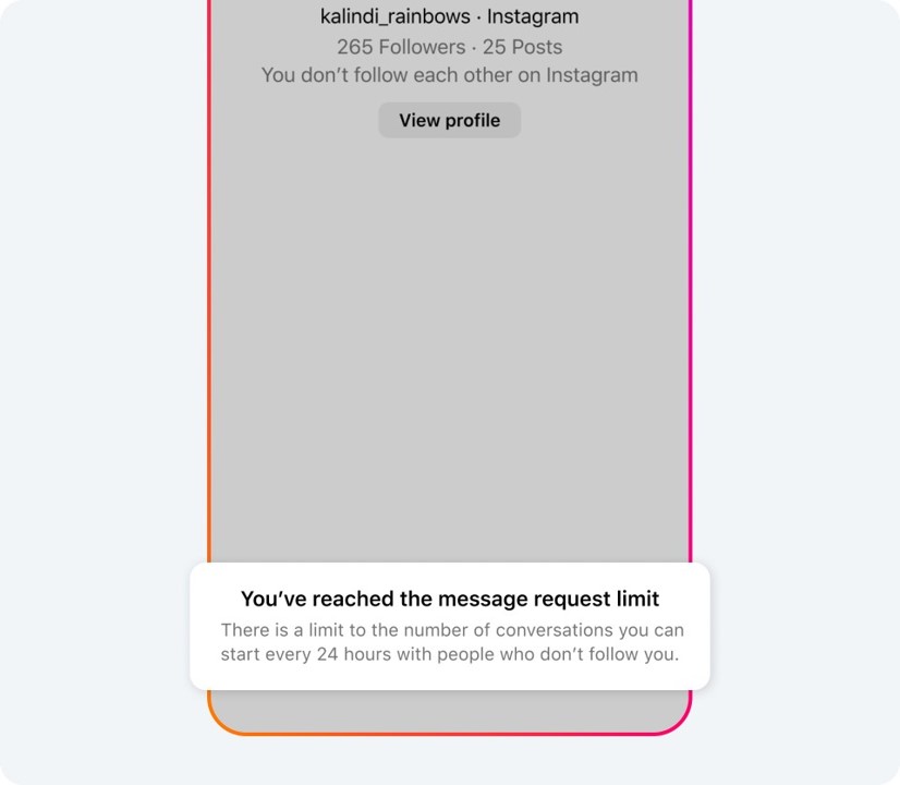 Queremos proteger as pessoas de interações indesejadas nas DMs do Instagram, e essas proteções são especialmente importantes quando falamos desse público. Já apresentamos Avisos de Segurança quando adultos que mostraram comportamento potencialmente suspeito enviam mensagens para adolescentes, e restringimos que pessoas com mais de 19 anos enviem mensagens privadas para adolescentes que não os seguem. Agora, estamos testando recursos adicionais para limitar como as pessoas podem interagir e enviar mensagens para outras pessoas que não as seguem: