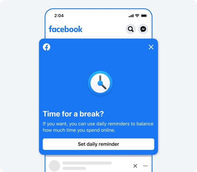 Queremos que os adolescentes se sintam bem com o tempo que passam em nossos aplicativos, e é por isso que criamos recursos como o “Faça uma Pausa”, no Instagram. Em breve, os usuários nessa faixa etária também verão uma notificação quando passarem 20 minutos no Facebook, solicitando que façam uma pausa no aplicativo e estabeleçam limites de tempo diários. Também estamos explorando um novo incentivo no Instagram, que sugere que os adolescentes fechem o aplicativo se estiverem utilizando os Reels à noite.