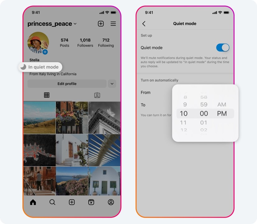 Em janeiro, introduzimos o Modo Silencioso no Instagram, um novo recurso para ajudar as pessoas a se concentrarem e incentivá-las a estabelecer limites com os seus amigos e seguidores. Por exemplo, ao ativar o Modo Silencioso, você não receberá nenhuma notificação, o status de atividade do seu perfil será alterado para que as pessoas saibam que você está no Modo Silencioso e enviaremos automaticamente uma resposta automática quando alguém lhe enviar uma DM. Estamos disponibilizando o Modo Silencioso globalmente no Instagram nas próximas semanas.