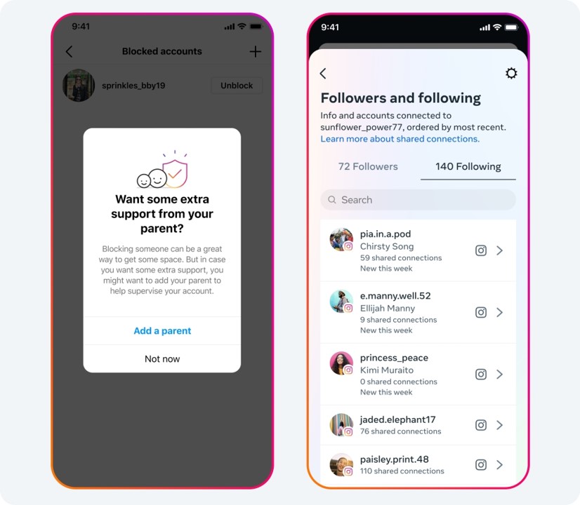 - Um novo aviso para adolescentes depois que eles bloquearam alguém. O aviso os incentiva a adicionarem seus pais para supervisionar sua conta no Instagram como uma camada extra de proteção. Por meio deste aviso, estamos lembrando adolescentes em momentos específicos de como eles podem se beneficiar da orientação dos pais quando se trata de observar suas interações on-line.