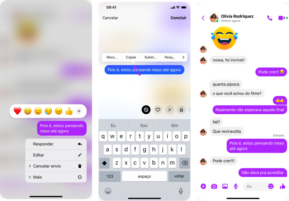 A partir de agora, você pode editar mensagens que tenham sido enviadas antes da hora ou que você simplesmente gostaria de alterar por até 15 minutos após enviá-las. Você ainda pode denunciar abuso em uma mensagem editada e a Meta poderá ver as versões anteriores da mensagem que foi editada.