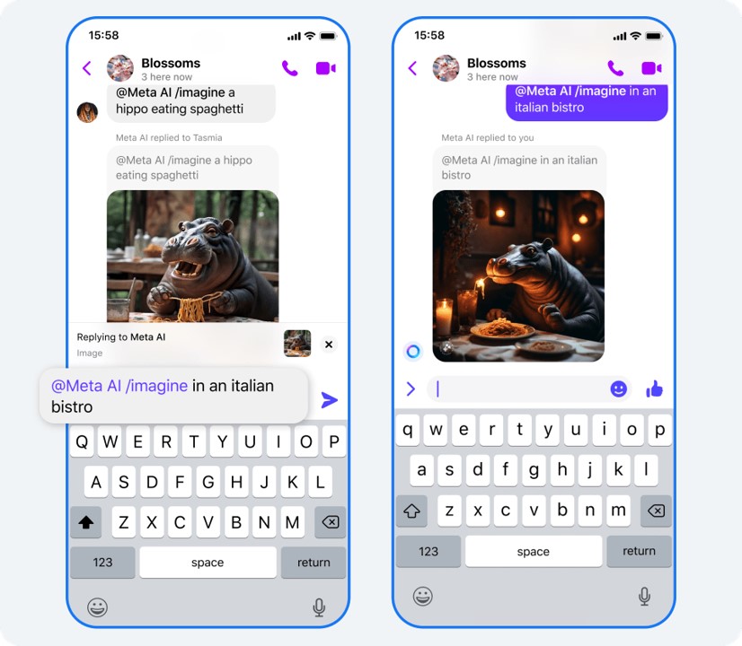 Um dos recursos mais usados da IA da Meta em nossos aplicativos de mensagens é o Imagine, nosso recurso de geração de texto para imagem que permite criar e compartilhar imagens de forma mais dinâmica. Estamos sempre procurando maneiras de tornar nossas IAs ainda mais divertidas e sociais, por isso hoje estamos entusiasmados em adicionar um novo recurso à IA da Meta no Messenger e Instagram chamado reimagine. Veja como funciona no bate-papo em grupo: a IA da Meta gera e compartilha a imagem inicial que você solicitou, então seu amigo pode pressionar e segurar a imagem para que possa alterá-la com um simples prompt de texto e a IA da Meta irá gerar uma imagem totalmente nova. Agora você pode criar imagens com os amigos, se divertindo enquanto tentam superar uns aos outros com ideias cada vez mais únicas.