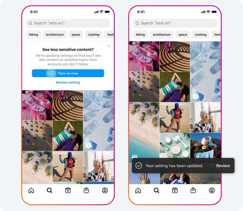 Estamos colocando automaticamente os adolescentes na configuração de controle de conteúdo mais restritiva no Instagram e no Facebook. Já aplicamos essa configuração para adolescentes quando eles ingressam no Instagram e no Facebook, e agora estamos expandindo essa funcionalidade para adolescentes que já estão utilizando esses aplicativos. Nossos controles de recomendação de conteúdo – conhecidos como “Controle de Conteúdo Sensível” no Instagram e “Reduzir” no Facebook – tornam mais difícil para as pessoas verem conteúdos ou contas potencialmente sensíveis em lugares como Pesquisar e Explorar.