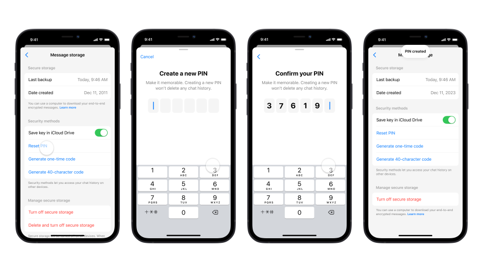 Você pode ativar o armazenamento seguro salvando uma chave de segurança no Google Drive, no iCloud Drive ou configurando um PIN de 6 dígitos.