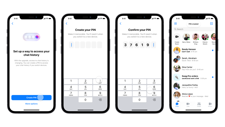 Depois de fazer o login no Messenger, você será solicitado a permitir que o Messenger recupere uma chave da sua conta do Google ou Apple ou insira seu PIN de 6 dígitos. Seu histórico de conversas criptografadas será restaurado. Caso você não tenha ativado o armazenamento seguro, seu histórico de conversas não estará disponível em novos dispositivos.