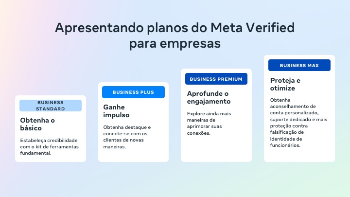 Com base nesses aprendizados, o Meta Verified agora oferece quatro planos de assinatura: Meta Verified Business Standard, Meta Verified Business Plus, Meta Verified Business Premium e Meta Verified Business Max. Com o Meta Verified, as empresas podem alcançar novas maneiras de construir credibilidade em nossos aplicativos e expandir sua marca.
