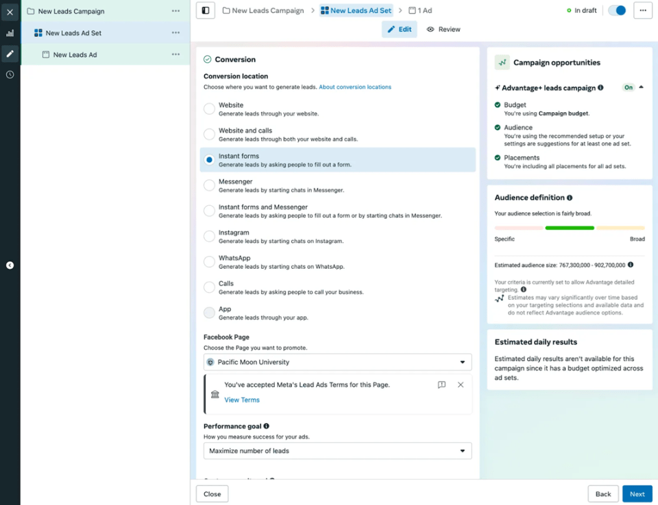 Os anunciantes frequentemente nos pedem para expandir a suíte Advantage+ para mais objetivos de campanha. Pensando nisso, estamos lançando as campanhas Advantage+ para captação de leads, permitindo que os anunciantes apliquem a automação completa de campanha para encontrar leads de alta qualidade de forma eficiente, com o auxílio da IA. A nova configuração simplificada do Advantage+ também será testada com as campanhas Advantage+ para captação de leads. Nos testes iniciais, as campanhas de leads que tinham o selo Advantage+ ativado nesta configuração apresentaram, em média, um custo por lead qualificado 10% mais baixo em comparação com campanhas com o Advantage+ desativado⁵.