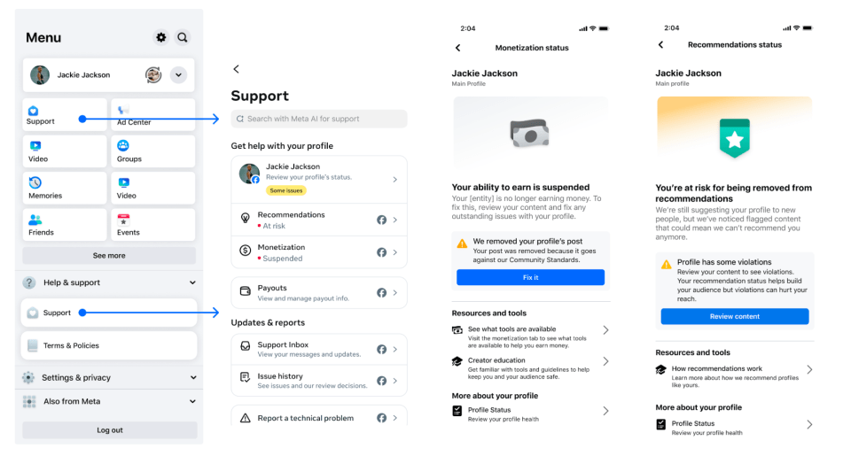 Agora, também é possível verificar se você está sob risco de sofrer penalidades em recomendação de conteúdo ou monetização na tela inicial do Suporte, acessível no menu principal da sua Página ou perfil profissional. Verifique seu status regularmente para garantir que você possa continuar crescendo e monetizando.