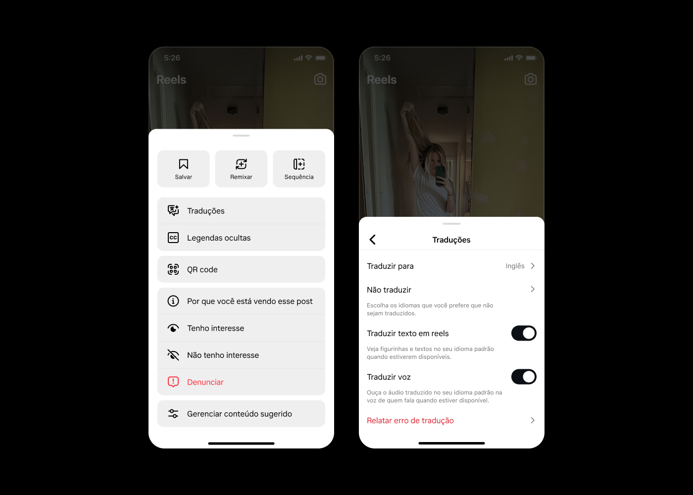 Sua experiência é importante para nós, por isso criamos controles para que você decida em quais idiomas deseja assistir. Todo reel traduzido é claramente identificado com o selo “Traduzido com Meta AI”, assim você sempre saberá quando está assistindo a um conteúdo traduzido. Você também pode escolher ativar ou desativar as traduções, ou assistir aos reels no idioma original – basta selecionar “Não traduzir” na seção de áudio e idioma do menu de configurações (três pontos). Saiba como gerenciar suas preferências de idioma no Facebook e Instagram.