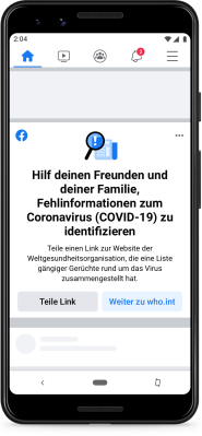 Wir zeigen im News Feed denjenigen Nutzern, die auf COVID-19-bezogene Beiträge reagiert haben (beispielsweise mittels „Gefällt mir“ oder einer anderen Reaktion bzw. eines Kommentars), neue Informationen an, sofern wir den ursprünglichen Beitrag mittlerweile als schädliche Fehlinformation eingestuft und entfernt haben. Diese Meldungen verweisen die Menschen auf Klarstellungen der WHO zu COVID-19-Mythen, inklusive solcher, die wir von unseren Plattformen entfernen, da sie unmittelbar zu körperlichen Schäden führen können. Wir möchten Nutzern, die möglicherweise mit derartigen Inhalten interagiert haben, Fakten von einer vertrauenswürdigen Quelle an die Hand geben, da sie eventuell auch außerhalb von Facebook auf solche Behauptungen stoßen könnten.