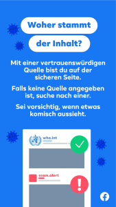 Wir arbeiten aktuell mehr denn je daran, Menschen auf vertrauenswürdige Informationen zu verweisen und Falschinformationen einzudämmen – insbesondere in Zusammenhang mit COVID-19. Wir haben umfangreiche Investitionen vorgenommen, um Konten und Inhalte zu entfernen, die gegen unsere Gemeinschaftsstandards oder Werberichtlinien verstoßen; die Verbreitung von Falschmeldungen zu reduzieren und Menschen zu informieren, indem wir ihnen mehr Kontext zu den Beiträgen in ihrem News Feed geben – damit sie selbst entscheiden können, was sie lesen, wem sie vertrauen und was sie teilen wollen.