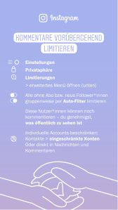Um bei einer großen Menge an Kommentaren oder bei einer besonders intensiven Debatte nicht den Überblick zu verlieren, können Nutzer*innen bei Instagram und Facebook festlegen, wer öffentliche Beiträge kommentieren kann. Auf Instagram können Kommentare auch gänzlich deaktiviert werden oder mit Hilfe der Funktion limitieren für einen gewissen Zeitraum auf langzeitige Follower*innen beschränkt werden. Das hilft besonders, wenn Sie sich plötzlich einer Flut von beleidigenden Kommentaren oder Direktnachrichten ausgesetzt sehen oder Derartiges erwarten.