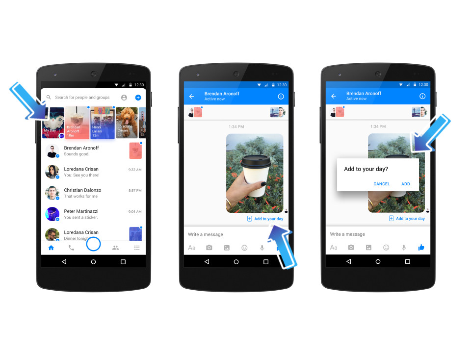 Al mismo tiempo, también comenzamos a probar nuevas maneras para compartir estas fotos y vídeos, según suceden, añadiéndolas a tu Día, donde muchos de tus amigos pueden verlas y responderlas. Siempre controlarás quién puede ver tu Día. Puedes compartirlo con todo el mundo o elegir amigos específicos y familiares en Messenger. Como todo lo que añades desaparece de tu Historia después de 24 horas, siéntete libre de añadir contenidos tan a menudo como quieras. Millones de personas en todo el mundo ya han utilizado su Historia para mostrar lo que están haciendo, cómo se sientes, para invitar a sus amigos a unirse a actividades o simplemente para conversar.