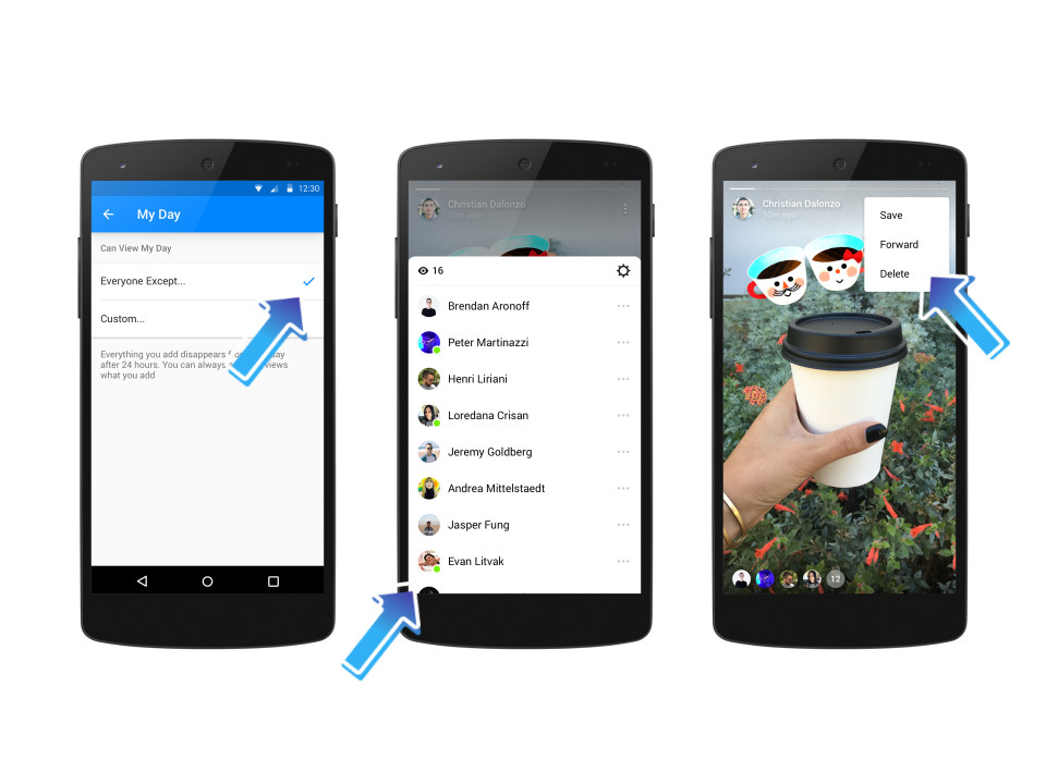 Por supuesto, puedes elegir si quieres compartir tu Día con todas las personas con las que hablas por Messenger o únicamente con tus amigos más íntimos y familiares. Puedes personalizar cómo compartes pulsando sobre el icono “ver más” y después escoger “amigos, excepto…” o “amigos concretos”. Si compartes algo en tu Día que decides que quieres quitar, tan solo tienes que pulsar la imagen en la parte superior de tu bandeja de entrada, y después pulsar los tres puntos en la esquina inferior derecha de tu imagen y seleccionar “Eliminar”.