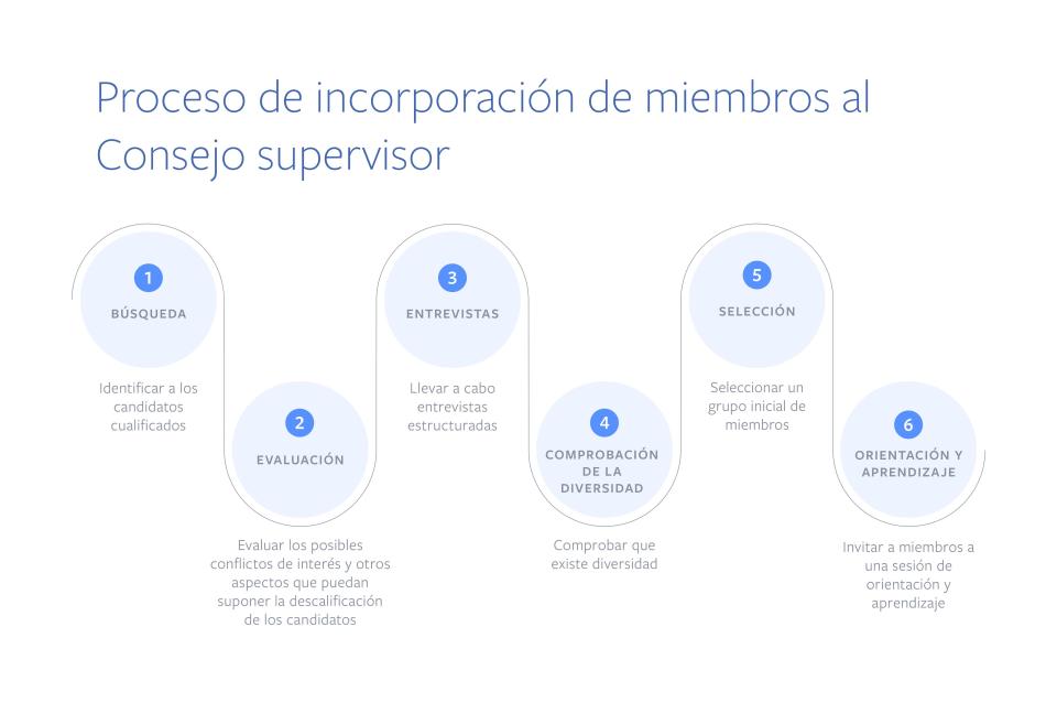 Después de examinar los comentarios recopilados en nuestro proceso de consulta, conversar con expertos en la materia y analizar las prácticas recomendadas del sector, se ha establecido un proceso de seis pasos para buscar y seleccionar a los miembros del Consejo.