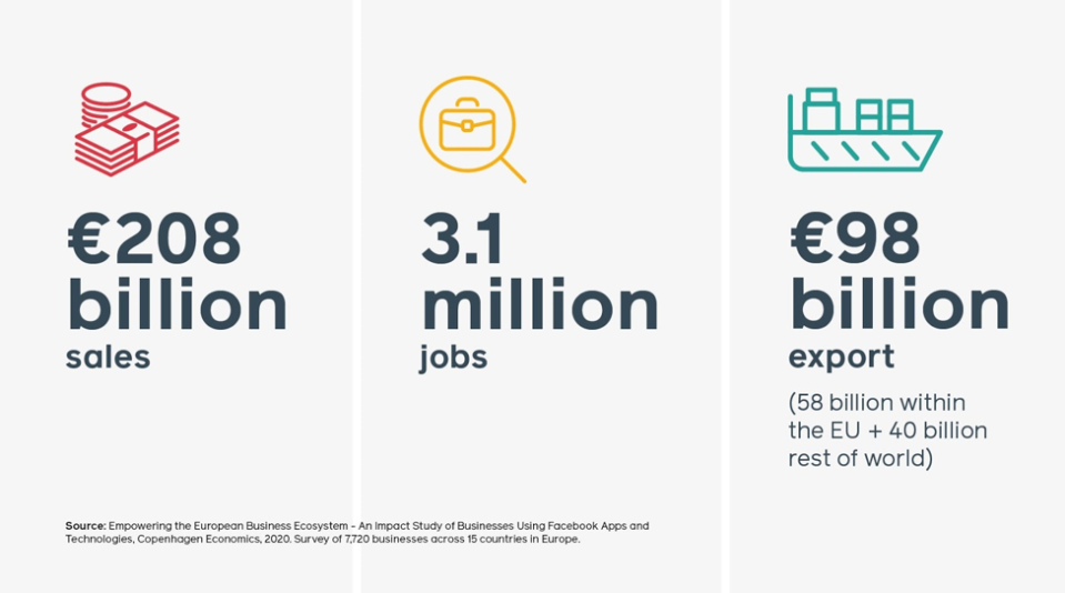 Las empresas encuestadas dijeron que el uso de las aplicaciones de Facebook les ayudó a generar ventas por un valor estimado de 208.000 millones de euros el año pasado. Utilizando técnicas de modelado económico estándar, esto se traduce en aproximadamente 3.1 millones de puestos de trabajo.