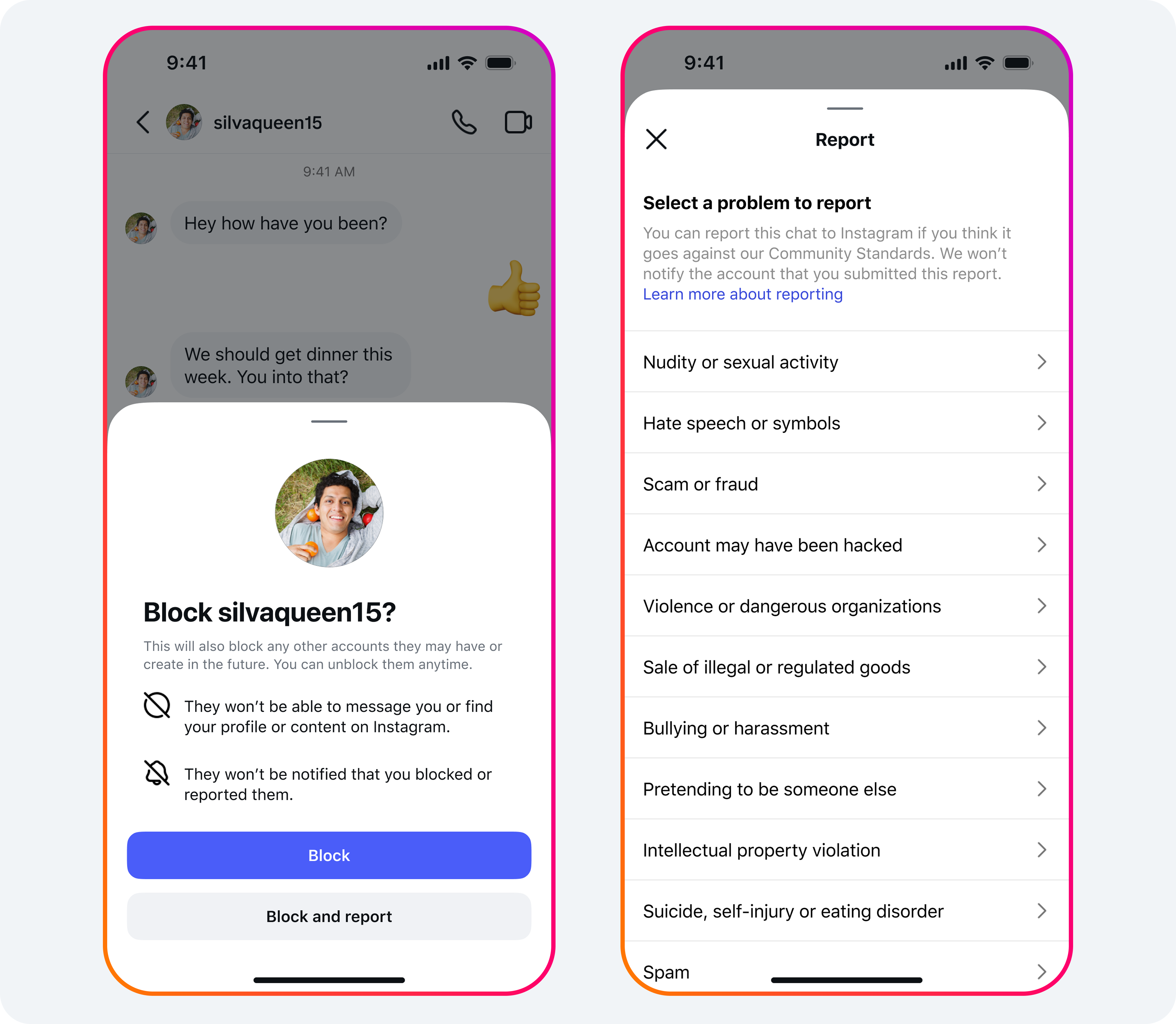 Estas nuevas funciones complementan los avisos de seguridad que mostramos para recordar a las personas que tengan cuidado con los mensajes privados y que bloqueen y denuncien cualquier contenido que les resulte incómodo. Nos alegra ver que los adolescentes están respondiendo a estos avisos. Solo en junio, bloquearon cuentas un millón de veces y denunciaron otro millón tras ver un aviso de seguridad.