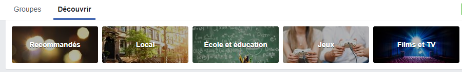 Facebook a classé les groupes autour de grandes thématiques afin de faciliter leur identification autour des centres d’intérêts des utilisateurs. Il suffit de se rendre dans l’onglet Groupe, situé à gauche du fil d’actualité, puis Découvrir, pour avoir accès à différentes catégories de groupes : école et éducation, jeux, voyage, arts et culture, etc.