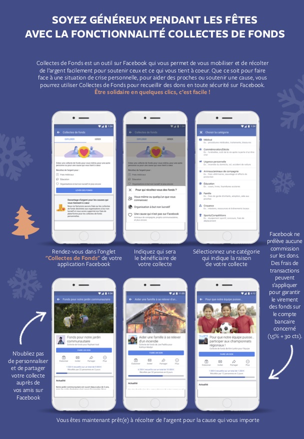“Plus de 20 millions de personnes ont déjà récolté plus d’un milliard de dollars pour des organisations à but non lucratif et des causes personnelles sur Facebook. Ce sont ces millions de personnes qui soutiennent la vie associative, qui se mobilisent pour aider les autres et pour avoir un impact positif sur leurs communautés. Avec le lancement aujourd’hui de Collectes de Fonds en France, nous espérons continuer de faciliter l’entraide sur Facebook. Nous souhaitons également sensibiliser les Français aux initiatives solidaires et nous les mettrons à l’honneur sur notre Page “Facebook France” pendant tout ce mois de #DécembreEnsemble.”