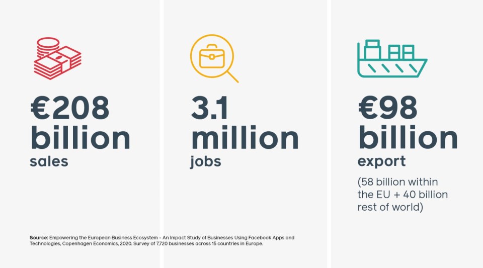 Les entreprises ont également déclaré que leur utilisation des applications Facebook a permis de réaliser des exportations à hauteur de 98 milliards d’euros l’année dernière. Sur ces exportations, 58 milliards d’euros représentent des ventes réalisées au sein de l’UE et 40 milliards d’euros dans le reste du monde.