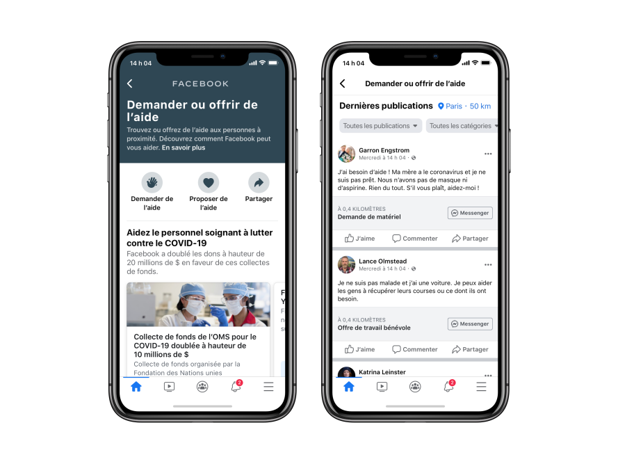 L’outil montre les offres et demandes d’aide dans un rayon de maximum 100 km autour de chaque utilisateur. Il est accessible depuis le Centre d’information sur le COVID-19 ou en se rendant sur facebook.com/covidsupport.