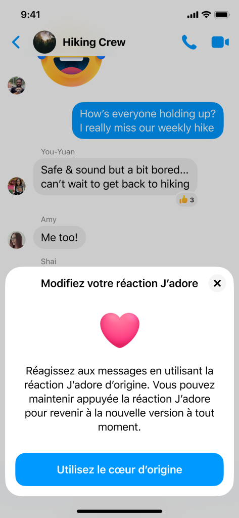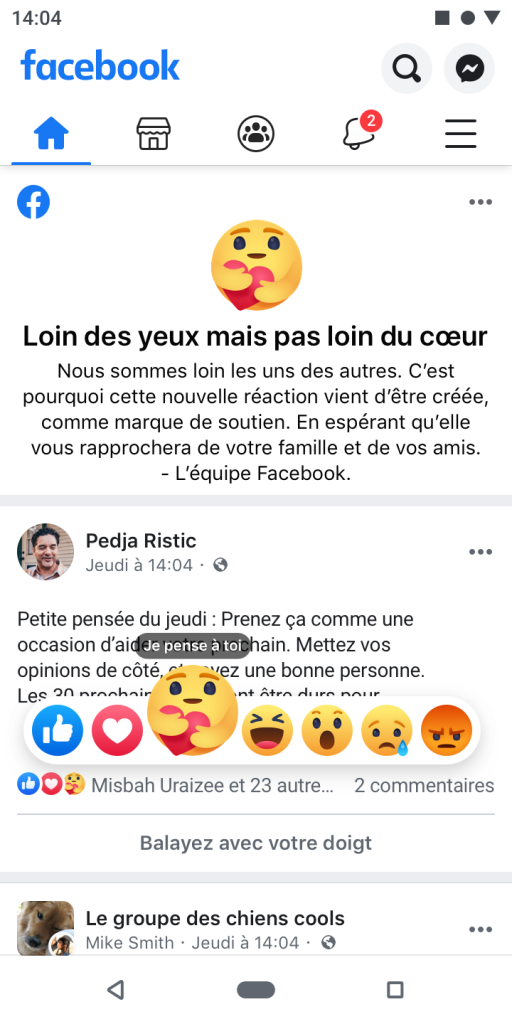 En plus de tout mettre en œuvre pour proposer des informations fiables et à jour, nous voulions que chacun dispose d’une réaction appropriée en cette période particulière. La nouvelle réaction sera déployée dès aujourd’hui sur Messenger et à partir de la semaine prochaine sur Facebook.