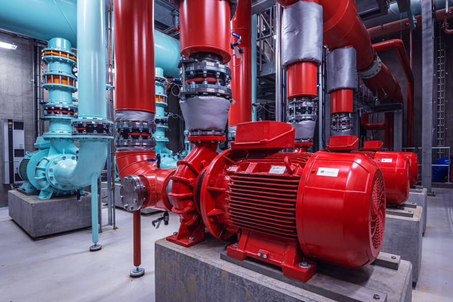 Plutôt que de rejeter l’air chaud des serveurs dans l’atmosphère, l’installation d’Odense dirige la chaleur à travers des serpentins en cuivre remplis d’eau. Fjernvarme Fyn achemine l’eau de sa pompe à chaleur par des tuyaux en acier isolés jusqu’au toit du centre de données, où elle est dirigée dans des serpentins en cuivre situés à l’intérieur de chacune des 176 unités de refroidissement. L’air chaud des serveurs y réchauffe l’eau qui circule dans les serpentins et, une fois réchauffée, l’eau est pompée vers la pompe à chaleur de Fjernvarme Fyn.
