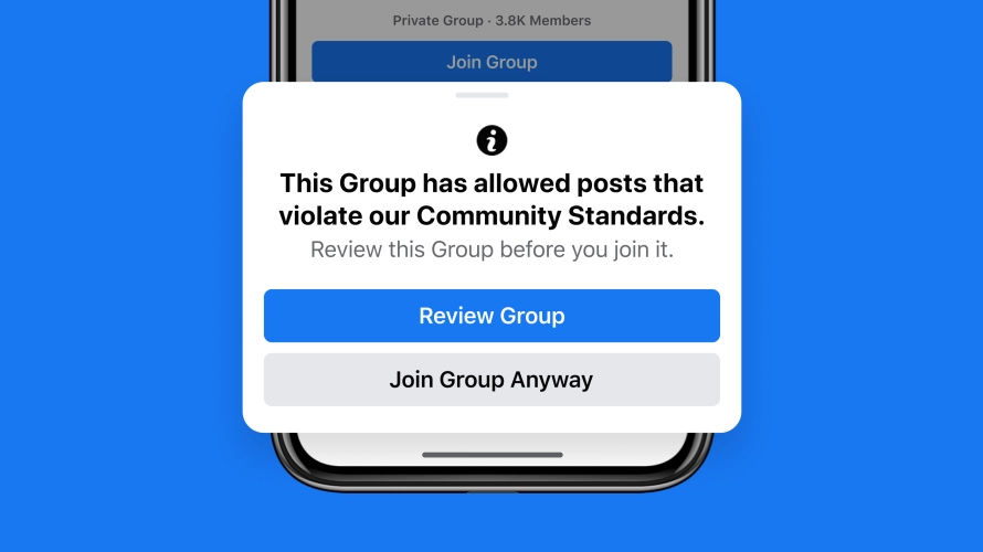 Nous commencerons à informer les utilisateurs lorsqu’ils sont sur le point de rejoindre un groupe qui a enfreint les Standards de la communauté à plusieurs reprises, afin qu’ils puissent décider de façon éclairée de rejoindre ou non ce groupe. Nous limiterons les notifications d’invitation à rejoindre ces groupes, afin que les utilisateurs soient moins susceptibles de les rejoindre. Concernant les utilisateurs d’ores et déjà membres de ces groupes, nous réduirons la visibilité des contenus de ces groupes afin qu’ils apparaissent plus bas dans leur fil d’actualité. Nous pensons que ces mesures associées à la réduction de la visibilité des groupes dans les recommandations rendra plus difficile la découverte et les engagements avec les groupes qui ne respectent pas nos règles.