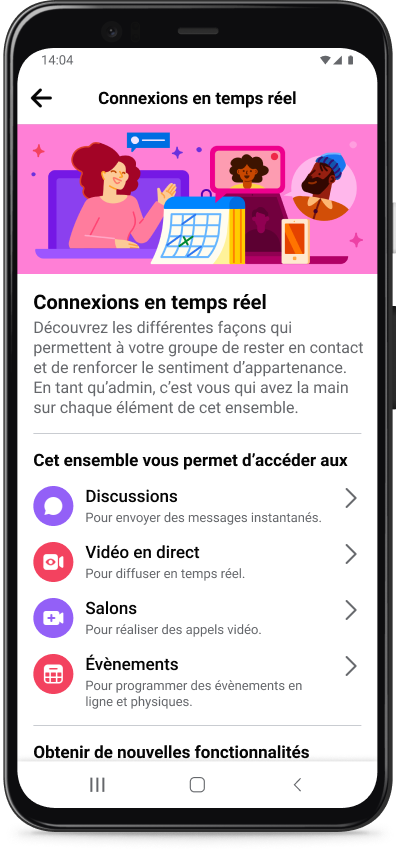 Pour communiquer en temps réel, les internautes pourront bientôt utiliser les discussions de la communauté dans Facebook et Messenger et créer des évènements récurrents lorsqu’ils souhaitent se retrouver plus régulièrement, en ligne ou en personne.