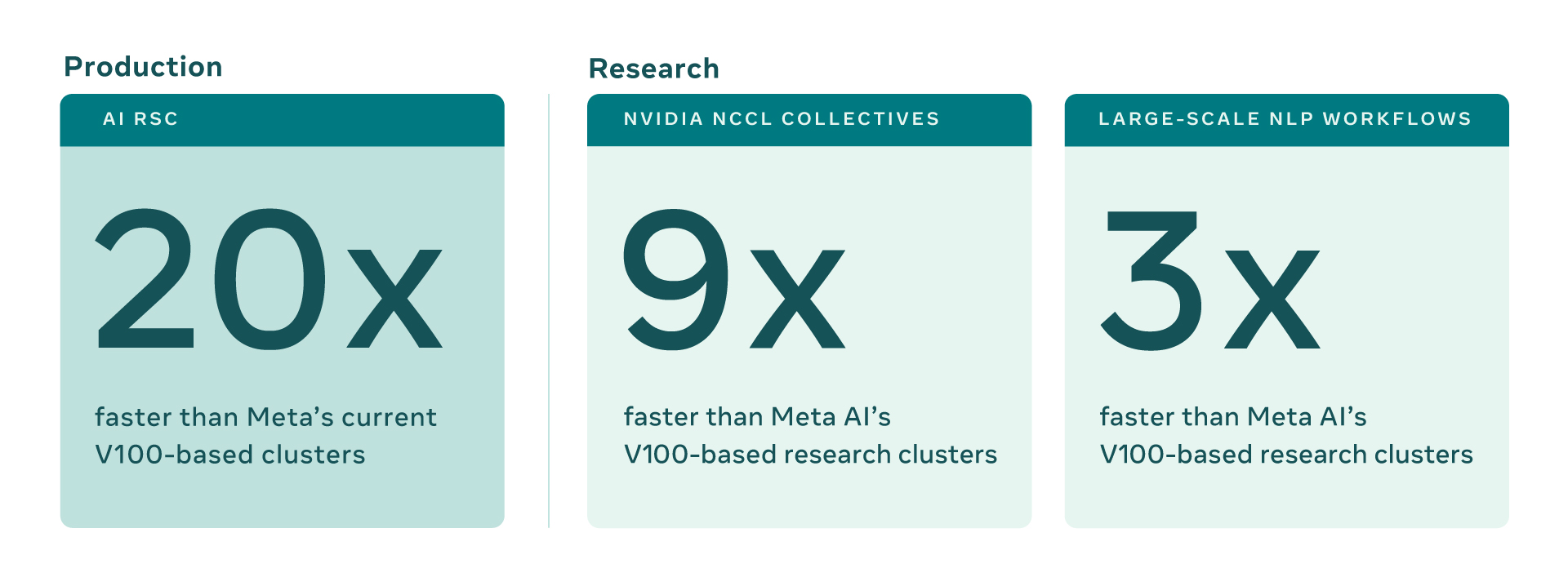 L’infrastructure informatique à haute performance est un élément essentiel de l’entraînement de modèles aussi vastes, et l’équipe de recherche en intelligence artificielle de Meta élabore ces systèmes à haute puissance depuis de nombreuses années. La première génération de cette infrastructure, conçue en 2017, compte 22 000 processeurs graphiques NVIDIA V100 Tensor Core dans un seul cluster qui effectue 35 000 tâches d’entraînement par jour. Jusqu’à présent, cette infrastructure servait de référence en matière de performance, de fiabilité et de productivité pour les équipes de recherche de Meta.
