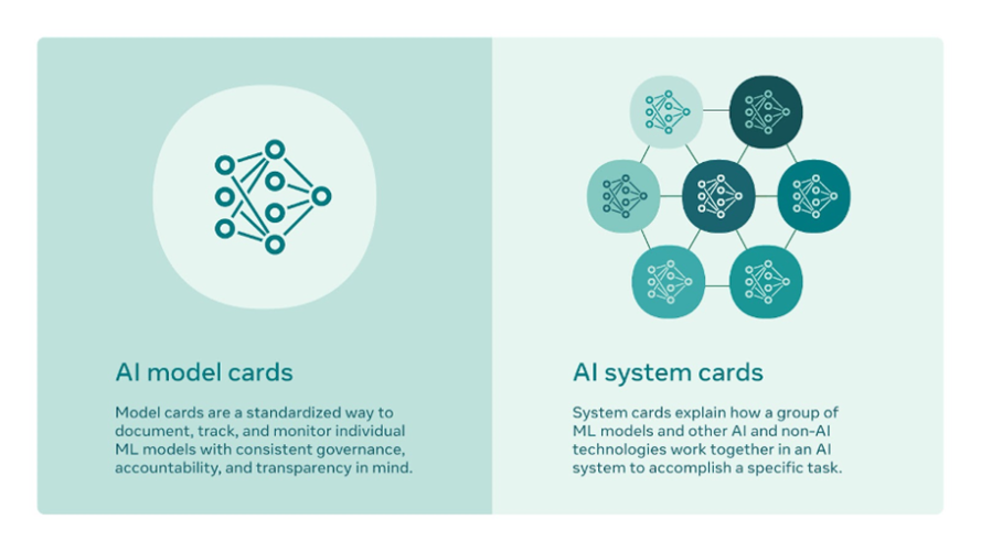 La plupart des modèles de machine learning (ML) sont compris dans un système d’intelligence artificielle plus vaste, un groupe de modèles de ML, de technologies d’IA et d’autres types qui fonctionnent ensemble pour réaliser des tâches spécifiques. Parce que les modèles de ML ne parviennent pas toujours à générer des résultats en travaillant isolément et qu’ils peuvent interagir différemment selon les systèmes dans lesquels ils sont compris, les cartes modèles, qui sont un standard de modèle de documentation largement accepté, n’offrent pas un aperçu exhaustif de ce que font les systèmes d’IA. Par exemple, nos modèles de classification d’image sont tous conçus pour prédire le contenu d’une image donnée. Mais ils peuvent être utilisés différemment dans un système axé sur l’intégrité, dont la mission est de signaler le contenu nuisible, ou encore dans un système de recommandation chargé de montrer aux personnes les publications susceptibles de les intéresser.