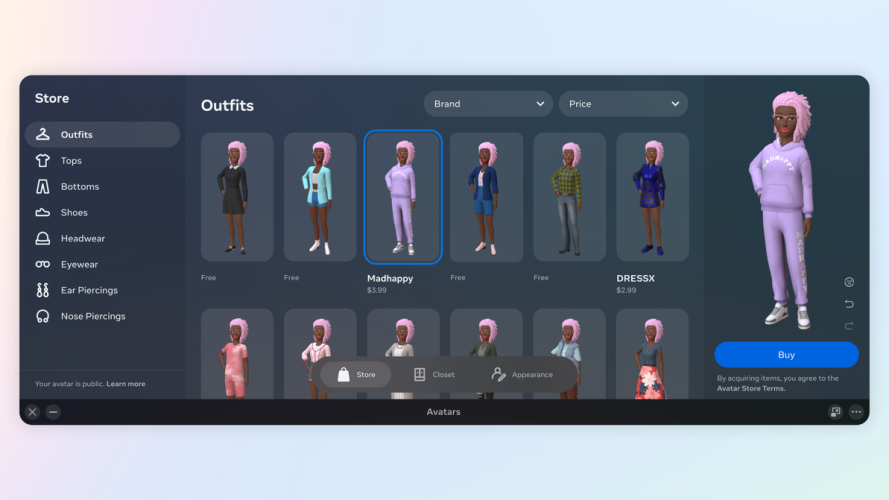 Ce que vous portez est également important. Nous avons annoncé aujourd’hui le lancement de l’Avatar Store dans la réalité virtuelle plus tard dans l’année. Vous pourrez acheter des vêtements virtuels auprès de certaines de vos marques préférées. Nous travaillons avec des partenaires dans les domaines du sport, du divertissement et autres pour nous assurer que vous trouverez des vêtements qui correspondent à votre style personnel. Nous espérons que cela donnera le coup d’envoi d’un marché pour les biens numériques interopérables, c’est-à-dire que si vous achetez un pull, vous pourrez le porter sur votre avatar, quelle que soit l’application que vous utilisez.